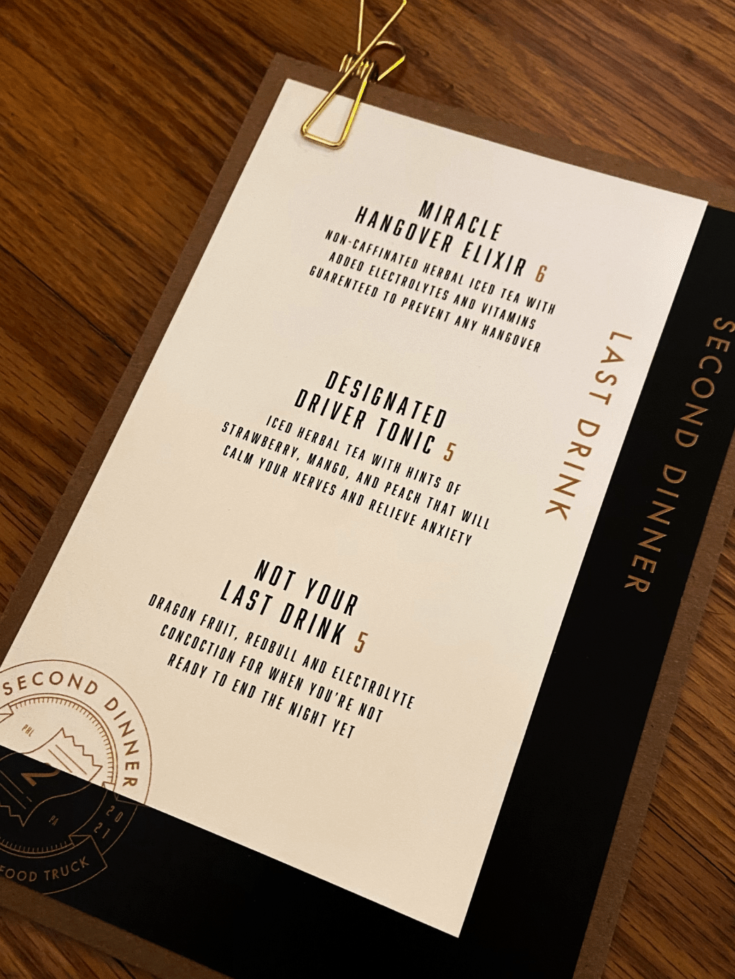 Second Dinner Food Truck was created for the night owl who needs a break between bar-hop stops. This after hours food truck provides an elevated take on classic bar foods and whimsical drinks like the hangover elixir and designated driver tonic, all in a way that’s portable for on the go. With inspiration from ‘20s speakeasies, customers will feel like they happened upon a gem at the exact right time.